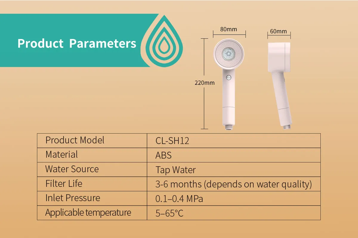 Product features: 5 stages filtration Easy installation Soft shower experience Nourishing shower Parameter Product Model: CL-SH20 Material:ABS PP Water Source:Tap water Lifespan:3-6 months(depends on water quality) Operating Pressure:0.05-0.55MPa App...