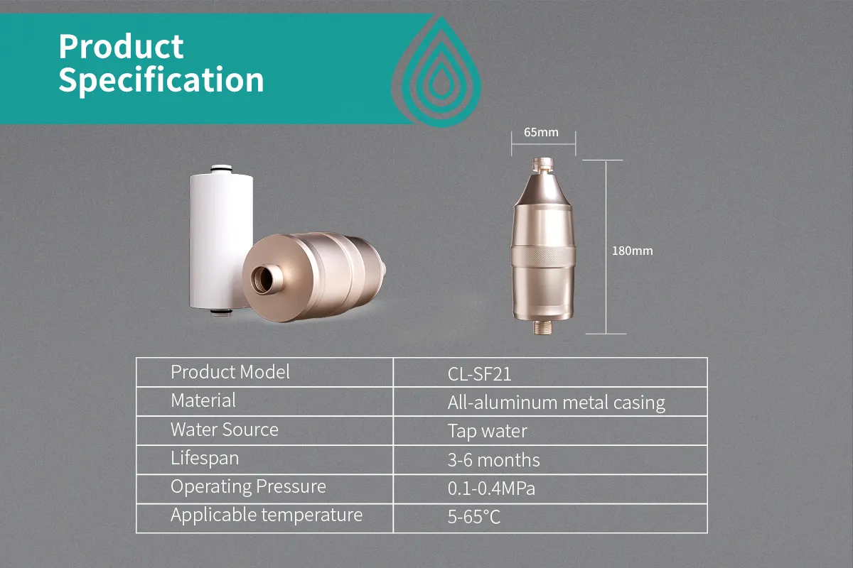 Product features: 15 stages filtration Easy installation Soft shower experience Nourishing shower Skincare and haircare Product Advantages: Product Model:CL-SF20 Material :Metal casing, Aluminum Alloy Water Source:Tap water Lifespan:3-6 months Opera...