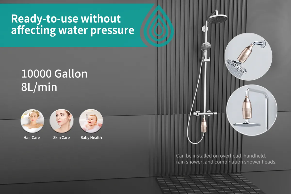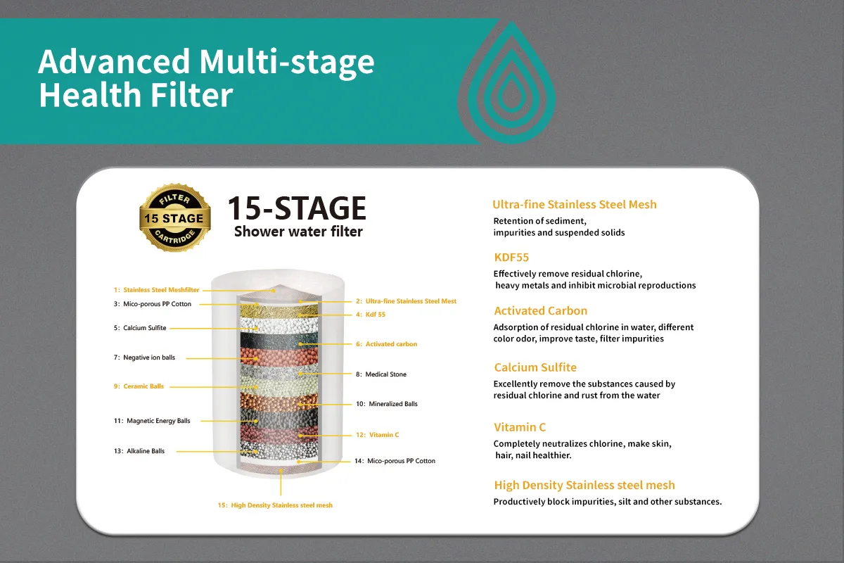 Product features: 15 stages filtration Easy installation Soft shower experience Nourishing shower Skincare and haircare Product Advantages: Product Model:CL-SF19 Material :Metal casing, Aluminum Alloy Water Source:Tap water Lifespan:3-6 months Opera...